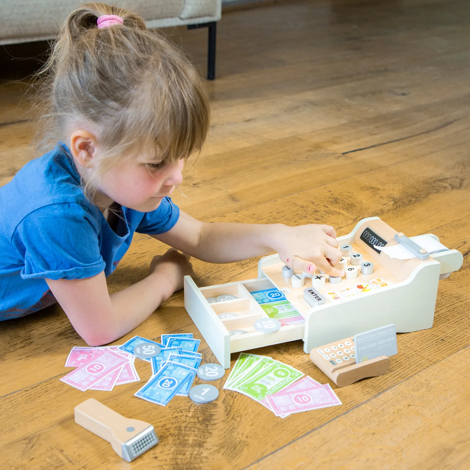 This cash register comes equipped with a drawer that you can take out, a scanner, a card reader, a till roll and 30 pieces of play money, 8 wooden coins and a credit card.