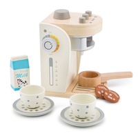 A colourful wooden coffee maker set from New Classic Toys. Who wants a coffee? Everything you need for a good coffee! Includes 2 coffee pods to insert in the removable filter, a milk carton and 2 coffee cups with saucers.