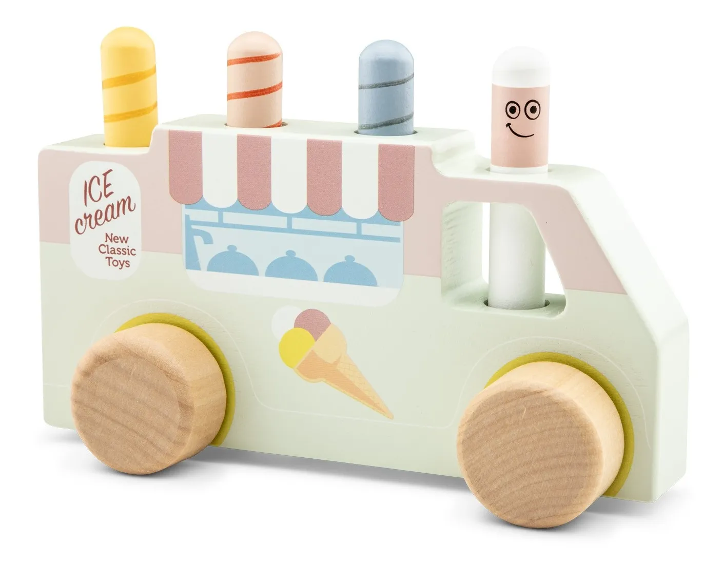 Push, pop and play! This wooden pop-up ice cream truck from New Classic Toys is spring-loaded and ready for fun! Press the figures down, watch them pop right back up and try to catch them as they soar into the air – it's a fun game that keeps little minds active and entertained.