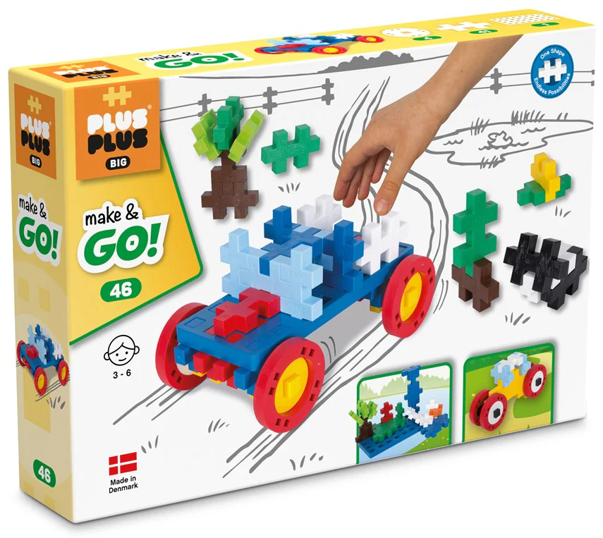 The Plus-Plus BIG Make & GO set contains everything you need to get started with Plus-Plus BIG GO and to make various types of vehicles. This set includes 1 baseplate, 4 BIG GO wheels and 41 pieces. A Guide Book gives step-by step instructions.