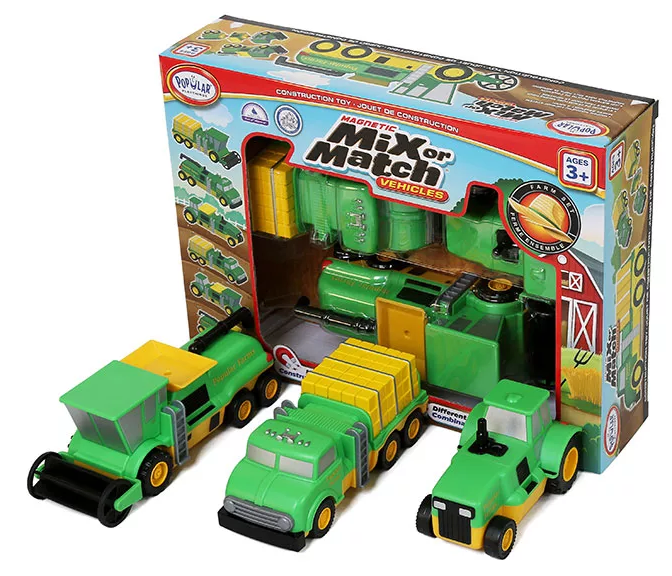 This set of three magnetic three-piece vehicles include a combine, a tractor, and a hay truck. The pieces are interchangeable, allowing kids to make hundreds of vehicle combinations.