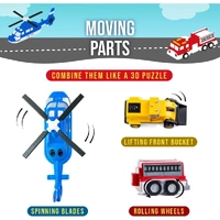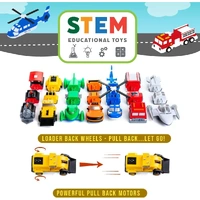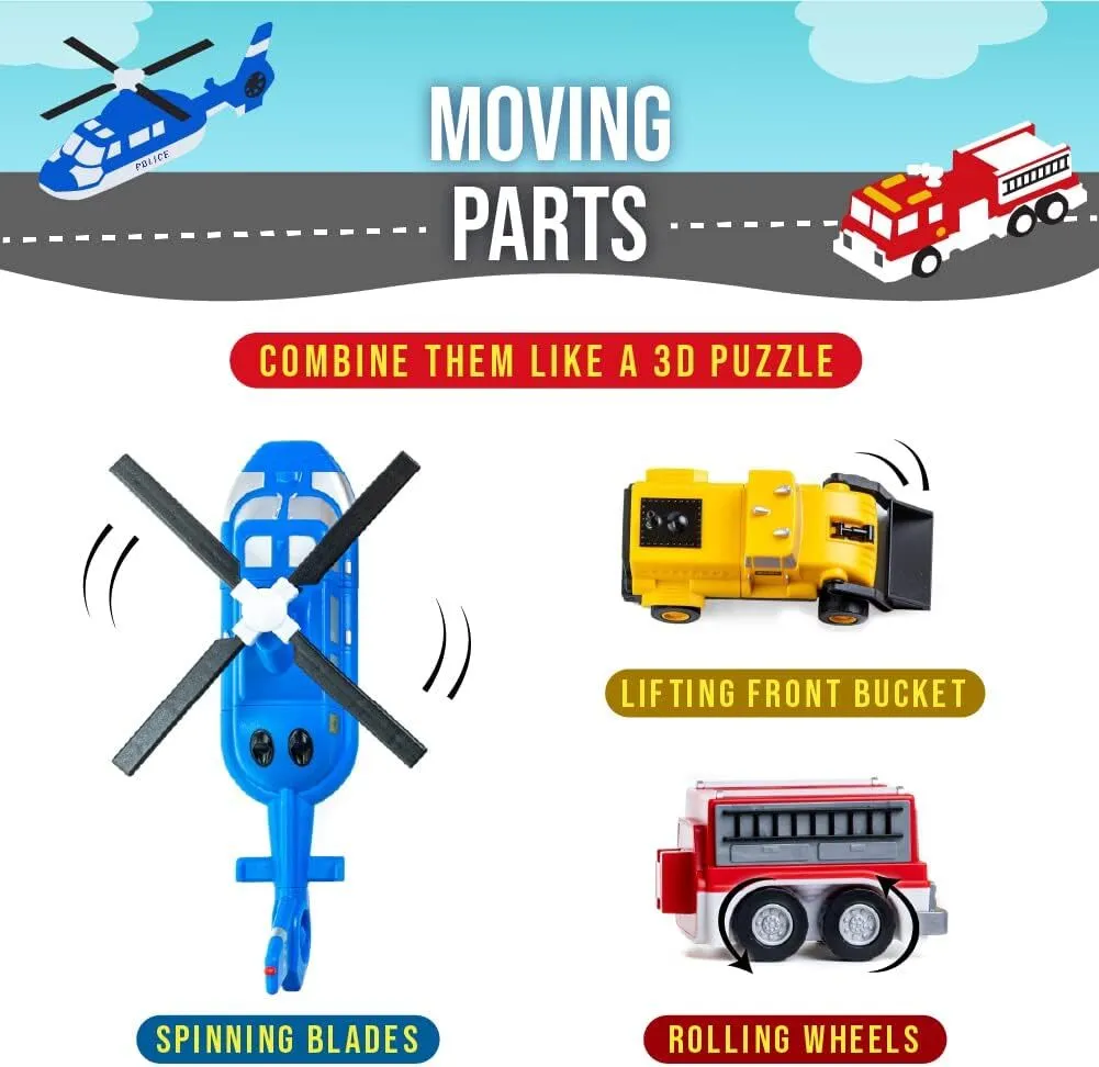 There are 1,000’s of vehicle combinations in this set! Three of the vehicles have pull-back propulsion. Unlock a child’s imagination and watch them play for hours on end!