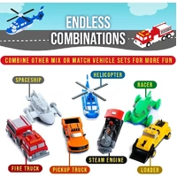 This set of 7-piece set of vehicles includes a fire truck, a pickup truck, a helicopter, a land speed racer, a loader, a spaceship, and a steam engine.