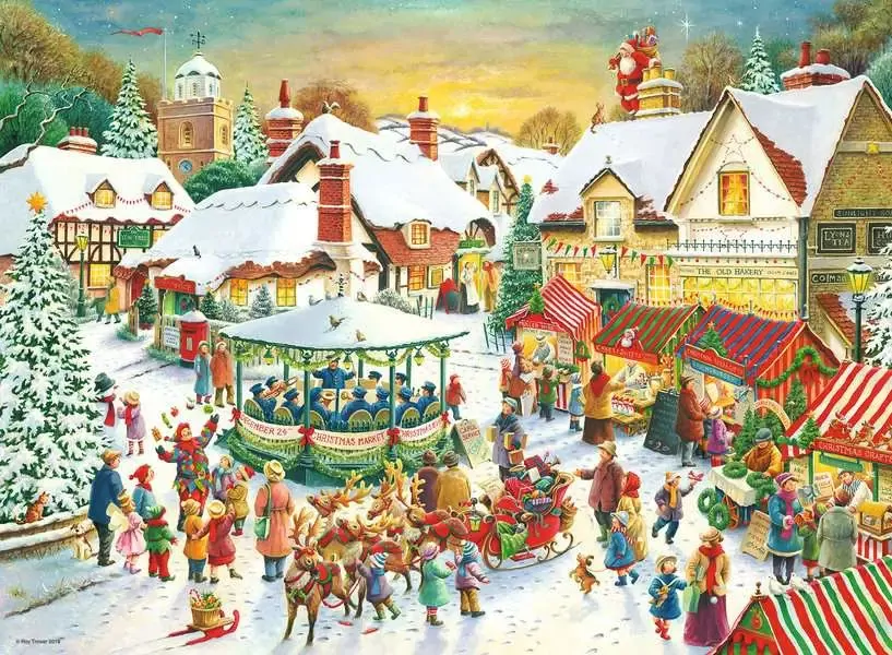 The Christmas Market: It's Christmas Eve and the village square is busy as people enjoy the annual Christmas Market. There's a band to play Christmas tunes, a juggler to keep the children entertained, and places to buy gifts and goodies. But just who organised the fantastic reindeer and impressive sleigh? No-one seems to have noticed Santa perched high up on the rooftop. We think he's made an early start to his Christmas Eve deliveries and has stopped to join in the fun!