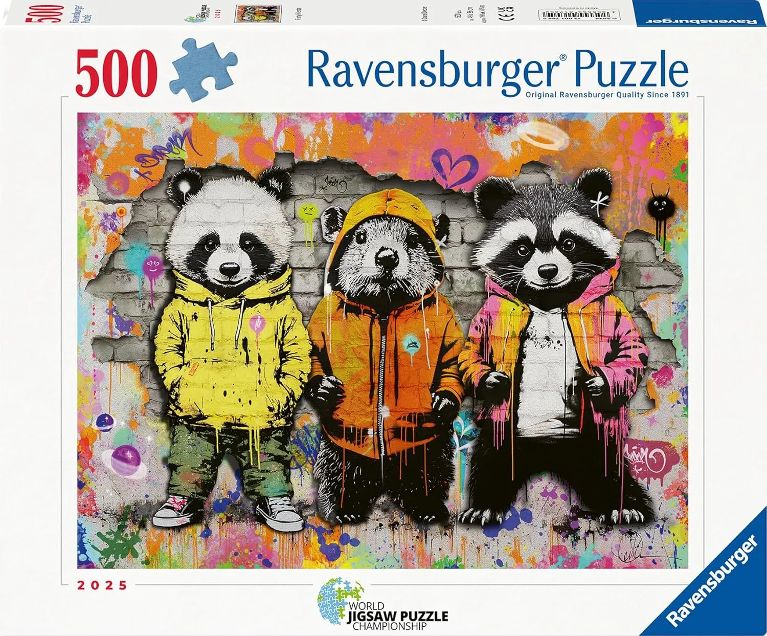 Brighten up your day with this delightful 500-piece jigsaw puzzle, Furry Friends. This playful scene features adorable animals dressed in cozy hoodies, posed in front of a textured wall surrounded by a vibrant splash of colours. Each furry friend adds a touch of warmth and charm to this charming urban mural.