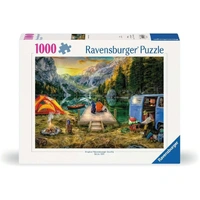 This premium quality jigsaw transports you to a serene lakeside oasis where you'll discover the simple joys of outdoor living, with an RV nestled by calm waters, a bonfire crackling and a loyal canine companion taking in the view beside his owner.
