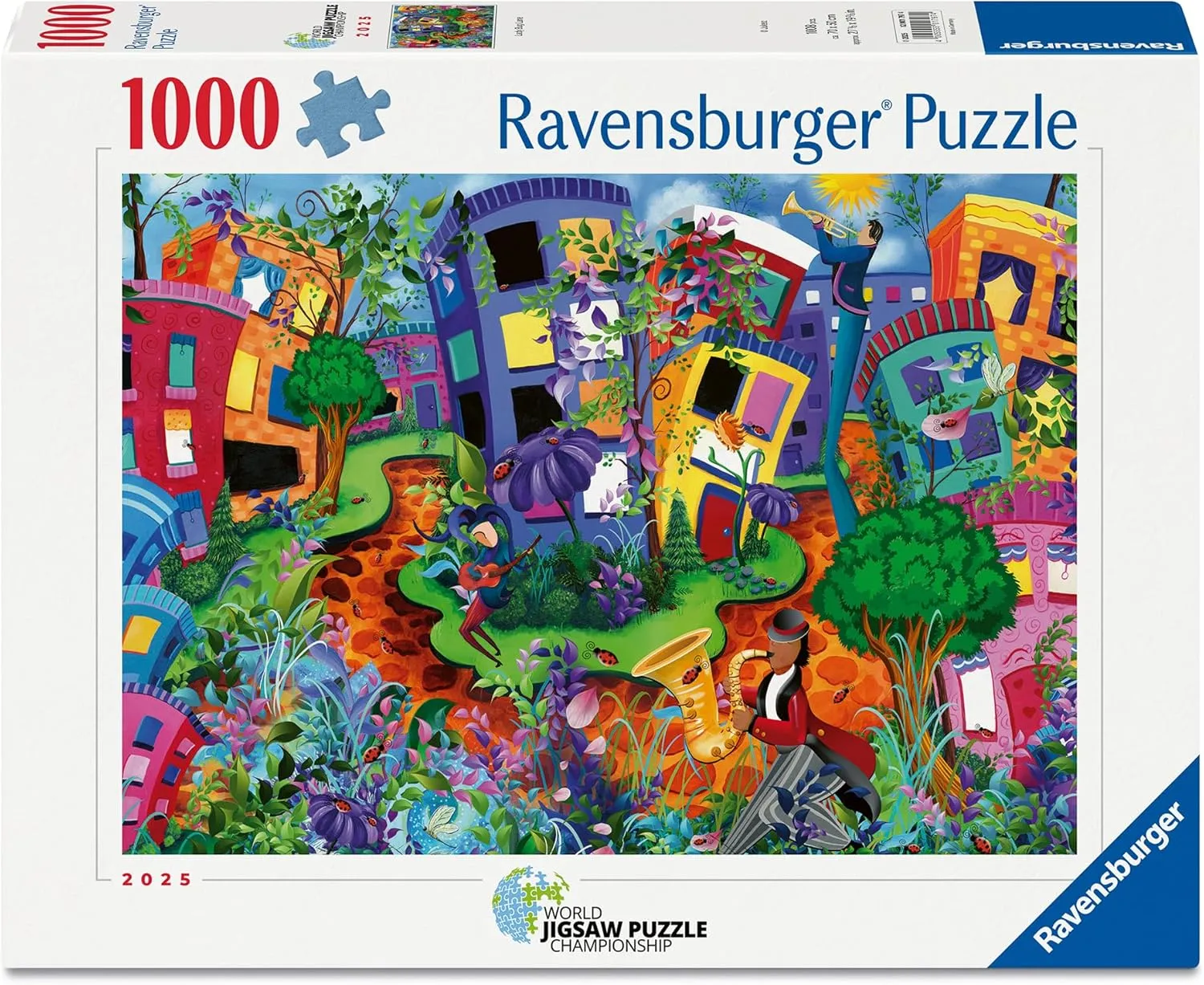 Step into the colourful world of Lady Bug Lane with this 1000 piece jigsaw puzzle. The lively scene features a winding, cobblestone lane lined with crooked, brightly painted houses, surrounded by lush, fantastical greenery. Ladybugs roam across flowers and foliage while whimsical characters play instruments, bringing the vibrant street to life. With 1000 precisely cut pieces, this puzzle offers a delightful challenge and a beautifully detailed finished image full of energy, colour, and playful charm.