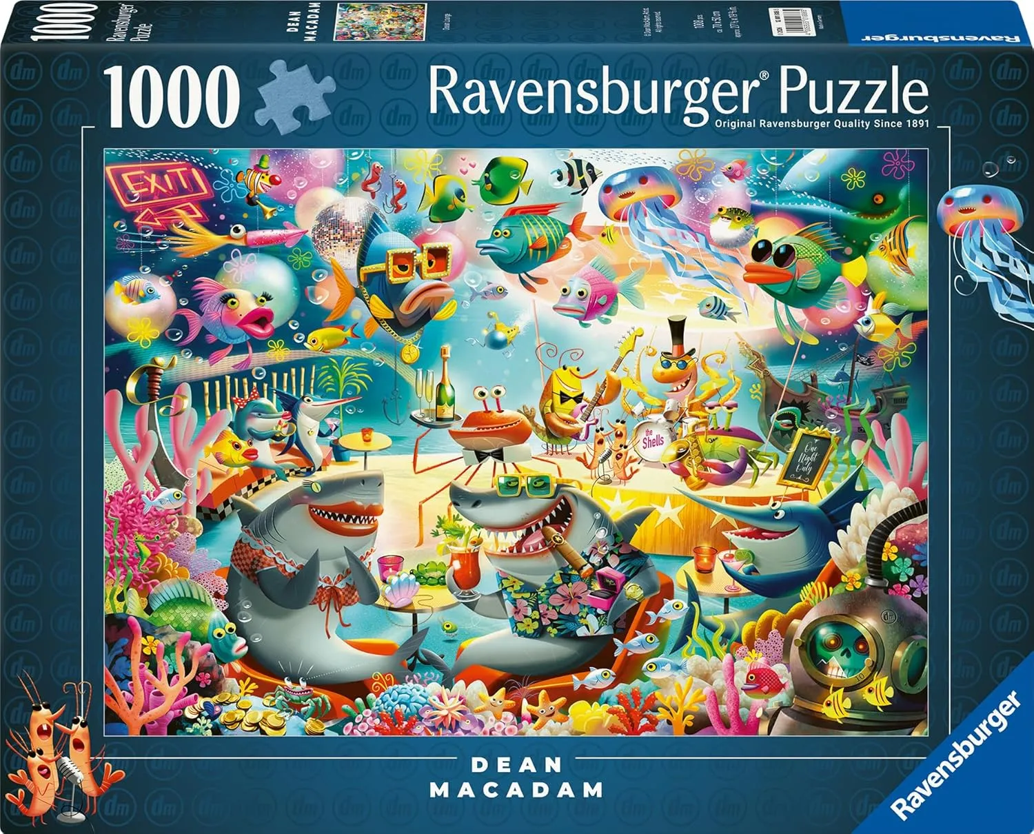 Sit back and enjoy the sounds of the Shells band in our brightly fun “Ocean Lounge”1000 piece jigsaw puzzle by Dean MacAdam. The cigar-chomping shark is in for a nasty surprise when he realizes the engagement ring for his sweetheart is missing. Do you think he’ll notice the sticky-fingered blue crab? That could put a damper on the fun. The deep-sea diver agrees, or would if he could.