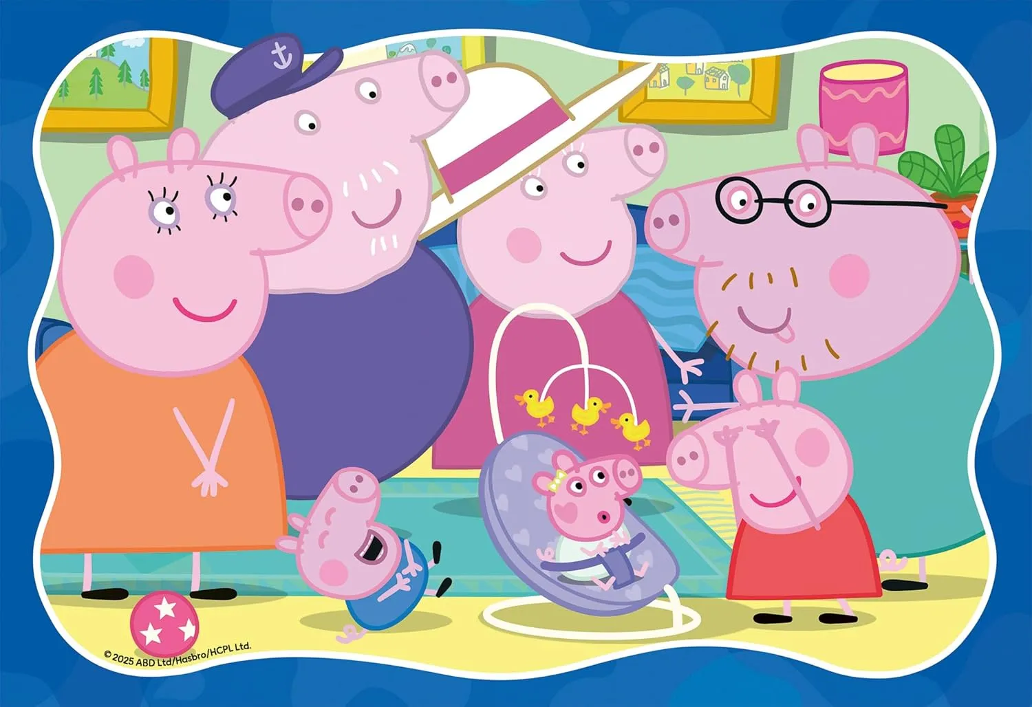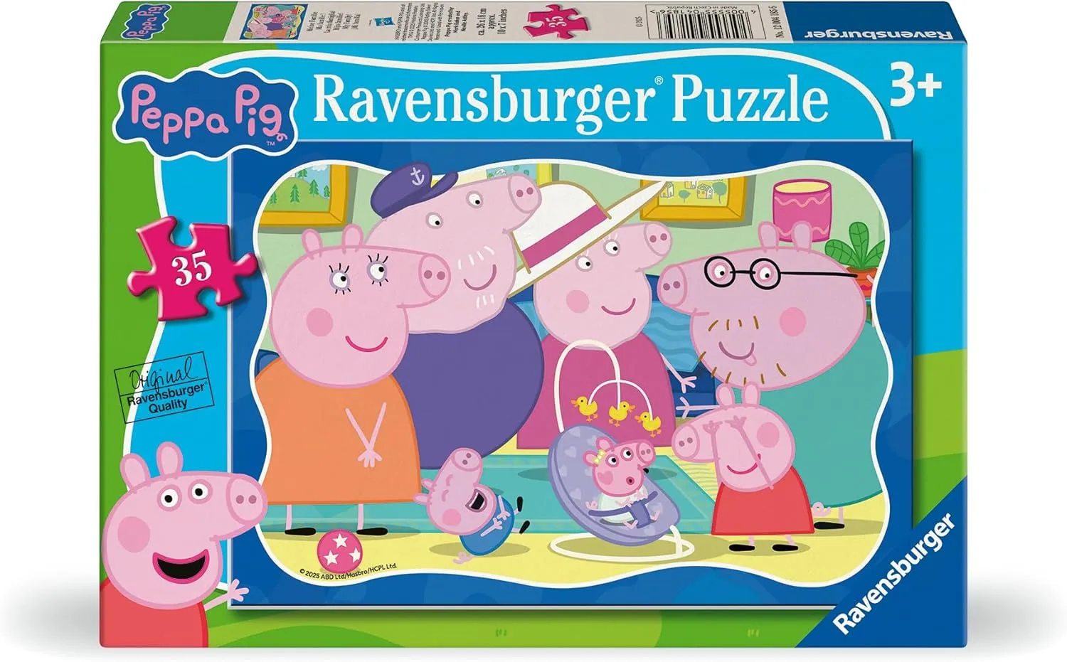 A bright and vibrant 35 piece puzzle featuring Peppa Pig with her family and beloved new sibling.