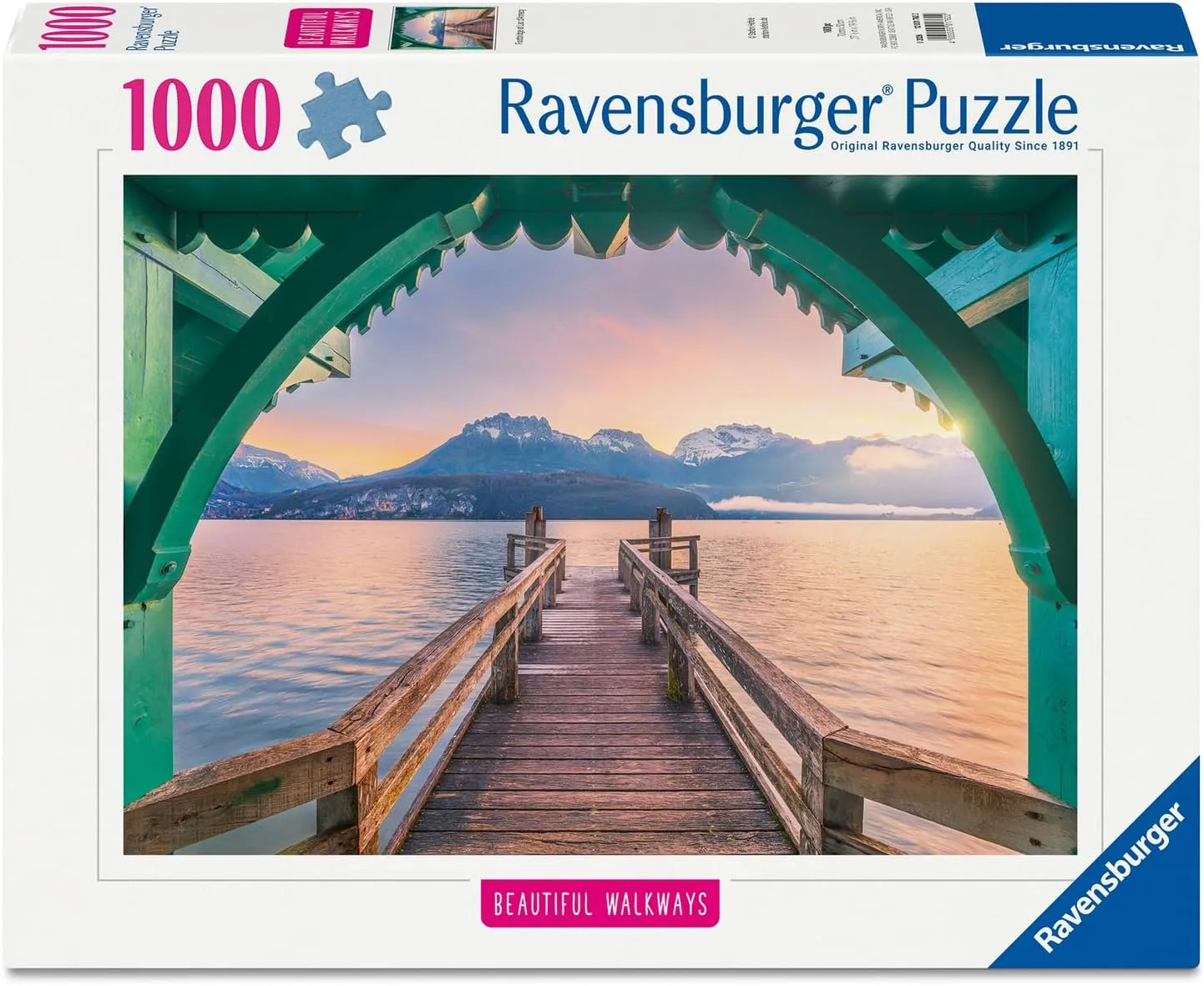 Experience the tranquil beauty of Ravensburger’s 1000-piece jigsaw puzzle, “Footbridge at Lac d'Annecy.” Captured by renowned photographer Stefan Hefele, this stunning image showcases a charming footbridge arching gracefully over the crystal-clear waters of France’s famed Lac d'Annecy. Framed by distant mountains and lush greenery, the scene invites you to slow down and savour the calm elegance of this idyllic lakeside setting. A perfect choice for puzzle enthusiasts who appreciate quiet moments, mindful challenges, and the timeless beauty of nature.