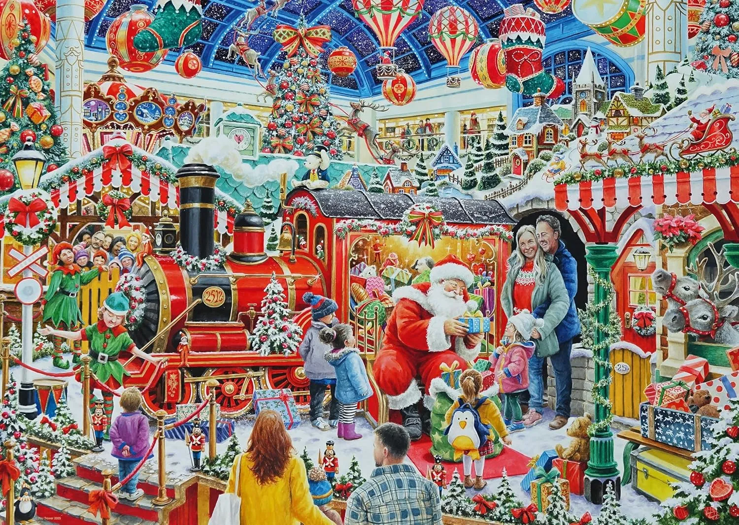 Experience the festive charm of the Ravensburger Christmas No 29 Puzzle, a limited edition 1000-piece jigsaw. Featuring Santa in his grotto with his steam train and reindeer, set in a beautifully decorated shopping centre filled with joyful families and holiday cheer.