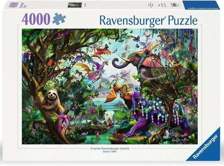 Step into a world where the rainforest comes alive with colour, wonder… and dragons! Lose yourself in the magical mayhem of Tropical Dragons, a breathtaking 4000-piece puzzle that bursts with imagination and detail. Deep within a lush tropical forest, brightly coloured dragons soar between towering palms, perch among exotic blossoms, and frolic in glittering waterfalls. Each creature is a playful spirit of the jungle—some mischievous, some majestic, all mesmerising. With a dazzling spectrum of hues and countless intricate features to discover, this puzzle is a joyful challenge for seasoned puzzlers. Watch as a vibrant dreamscape comes to life—scales shimmer, wings flap mid-flight, and mysterious creatures peek from behind jungle leaves.
