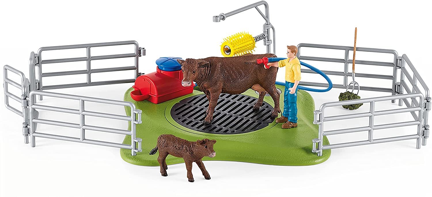 It's time to get the cows ready for the fair! Will you help the farmer wash and brush the cows? A warm bath feels so nice –the baby calf loves bath time! Kids will love giving the cows a bath in the Happy Cow Wash playset from Schleich. Just add water to use the fully functional wash station.