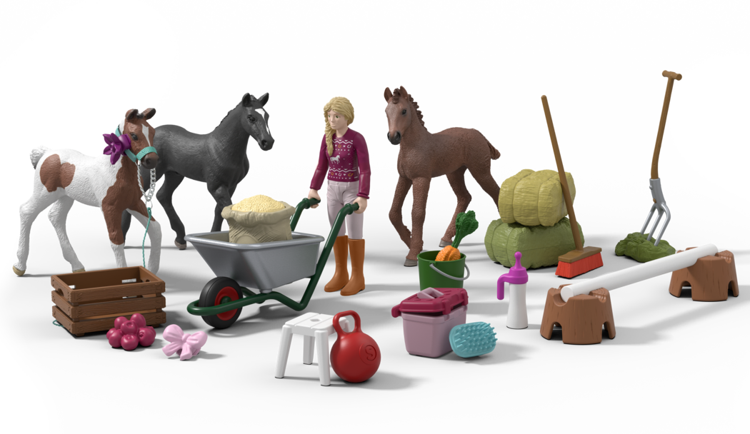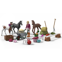 Set includes: 1x Holsteiner Foal, 1x Hanoverian Foal, 1x Friesian Foal, 1x Sarah figurine, 1x stable fork, 1x broom, 1x hay fork, 1x wheelbarrow, 1x bucket, 1x hay to spike on, 1x carrot, 1x red apple, 1x hay bale, 1x straw bale, 1x oat bag, 1x dummy bottle, 1x feed box, 1x cleaning box, 1x turquoise finger comb, 1x magenta flower hair clip, 1x pink bow hair clip, 1x white pole, 2x tree trunk obstacle, 1x stool, 1x play ball