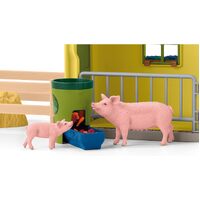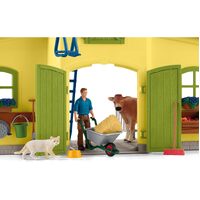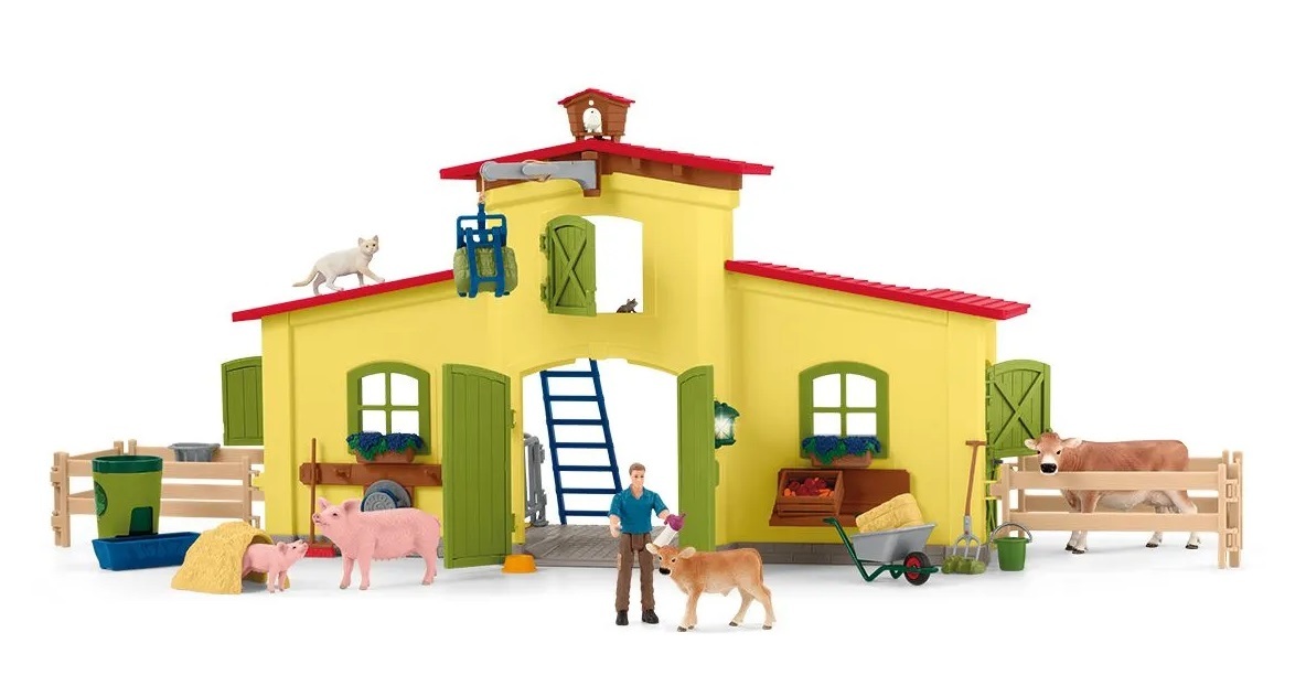 Set contains: 1x stable building, 1x Farmer Paul, 1x cow, 1x calf, 1x pig, 1x piglet, 1x cat, 1x dove, 1x mouse, 1x dovecote, 2x flower box, 2x straw feeder, 4x fence long, 2x fence short, 1x crane with winch, 1x fodder carousel, 1x hay hollow, 1x water hose, 1x ladder, 1x feed box, 1x rack, 1x bowl, 1x feeding bottle, 1x cow brush, 1x feeding trough, 1x pitchfork, 1x spikeable hay, 1x broom, 1x wheelbarrow, 1x bucket, 1x straw bale, 1x hay bale, 8x carrots, 6x apples, 1x eggs, 1x sticker sheet