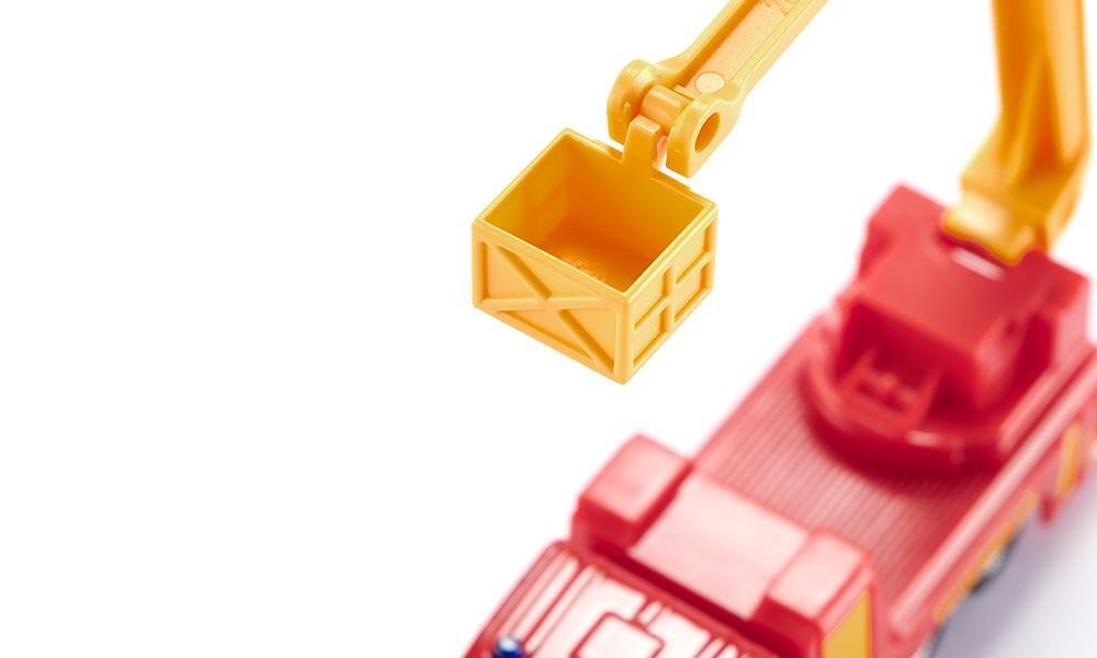 Fire on the fourth floor, and no escape is possible via the stairs – then the fire brigade rescue platform arrives on site at the emergency. Just like the full-scale prototype, the boom rotates, the basket pivots, and the elevating rescue platform can be folded out. The siku fire brigade elevating rescue platform dashes to the emergency on a 3-axle chassis with a metal cab.