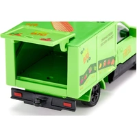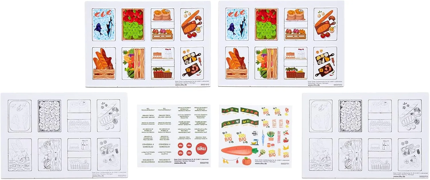 The driver’s cab of this Siku model is made of metal, and the superstructure is plastic. A flap at the rear can be opened for loading and unloading. With the sheet of stickers provided, the transporter can additionally be decorated with the lettering “Fresh organic deliveries” in various languages, and also with colourful images of fruit and vegetables. And because a delivery service requires suitable produce, there are also four cardboard sheets from which preprinted foodstuffs such as fruit, vegetables, eggs, and milk can be pressed out. However, on only two of the four sheets are the components printed in full colour. Only the outlines are printed on the other two sheets, and so the children themselves become creative and can colour the foodstuffs in whatever way they wish.