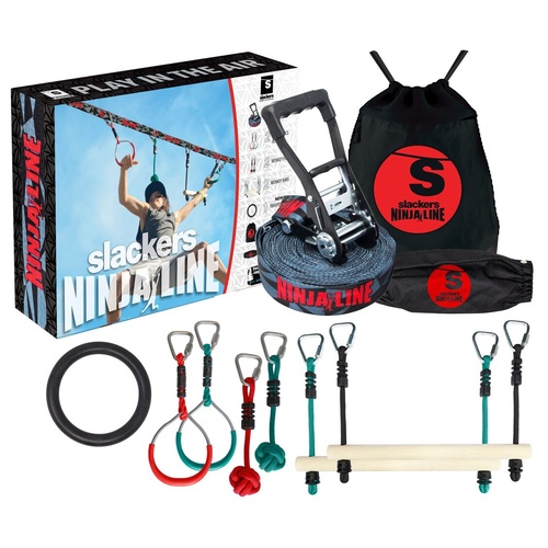 Train like a Ninja with the 30' slackers Ninjaline with 7 hanging obstacles. This versatile backyard outdoor hanging obstacle course kit allows the obstacles to be moved further apart as your skills improve. The included obstacles vary in skill level. Best of all, it's easy to install and take down, meaning you can take your training with you!