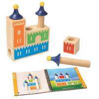 The challenge is to assemble the wooden blocks and towers into one of the castles in the puzzle booklet.