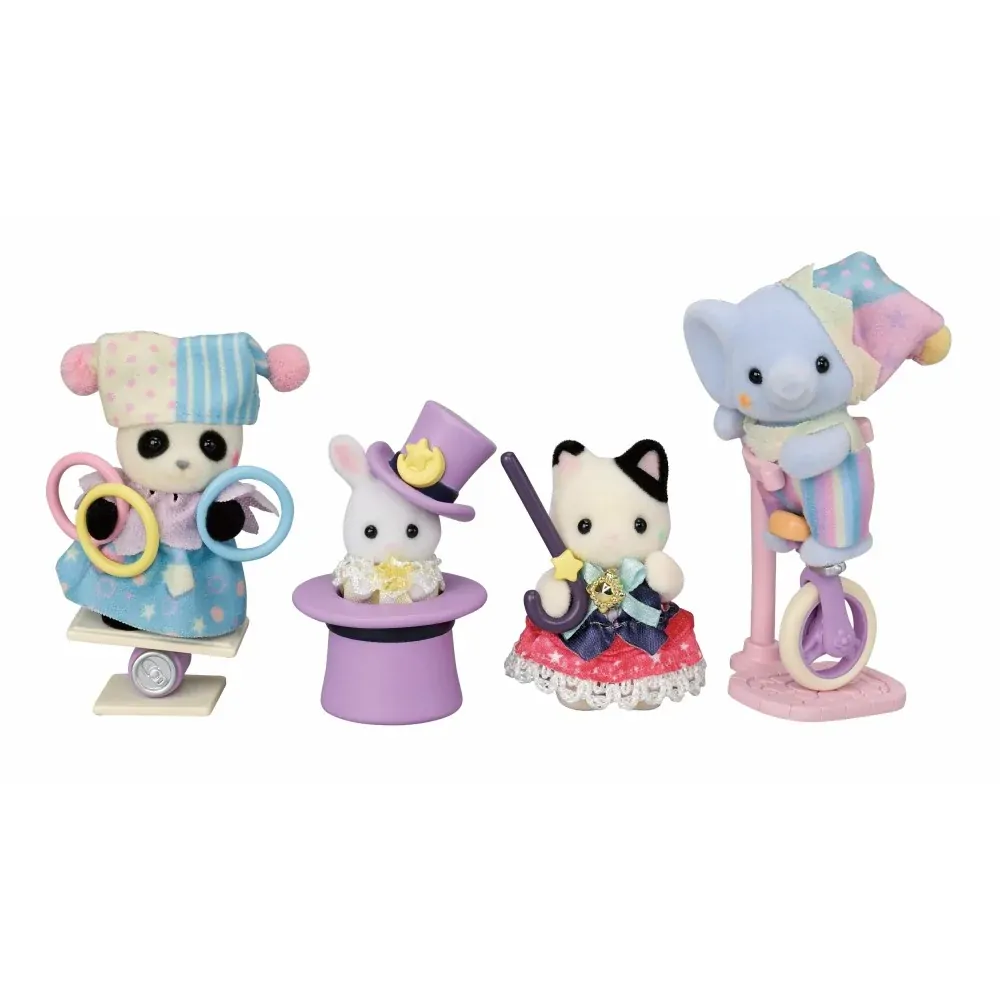 Featuring four adorable babies and a collection of accessories, they are ready for showtime at the amusement park. From juggling to magic tricks, there is so much fun to be had! Panda Baby, Angela, is spinning hoops as she balances on a board. Elephant Baby, Hilton, rides a unicycle whilst Charcoal Cat Baby, Angelica and White Rabbit Baby, Poplar, have teamed up to perform magic tricks.