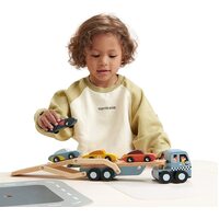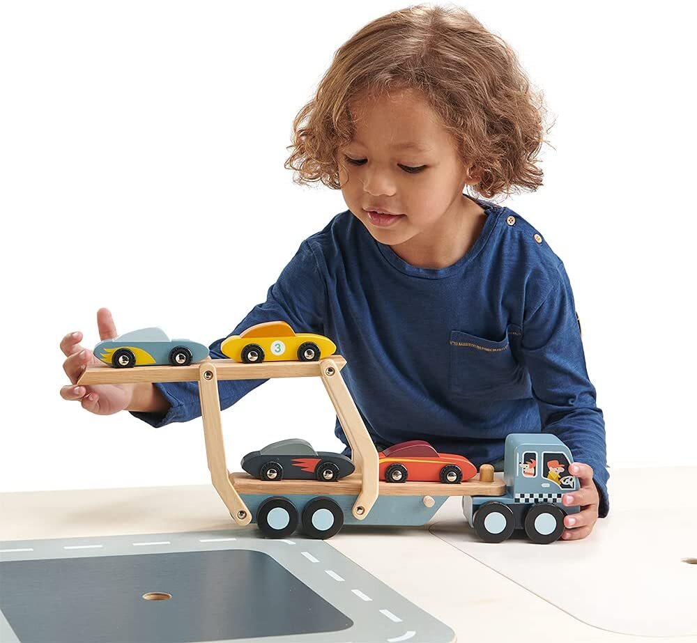 A solid wood transporter with detachable carrier, 4 stylish super cars with metal wheels and a lift down boarding ramp.