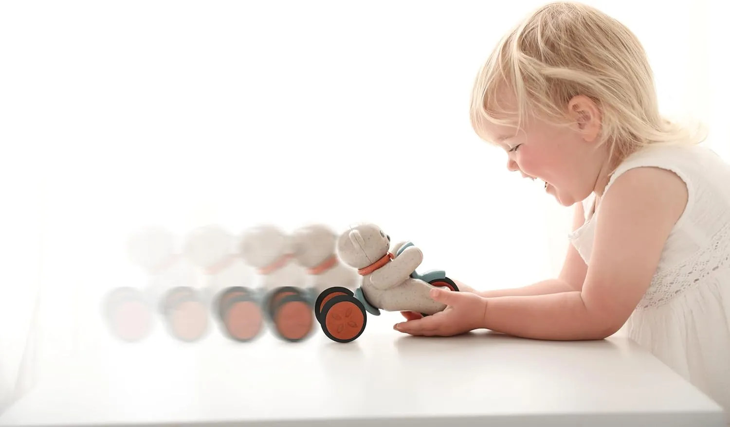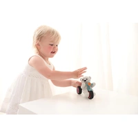 A classic wind-up toy with easy-to-learn and easy-to-use pump action. Pump the teddy to wind it up, let it go, and watch it move. Hours of fun for little ones. An early learning and developmental toy made from environmentally friendly wheat-fibre plastic. Develops fine motor skills.