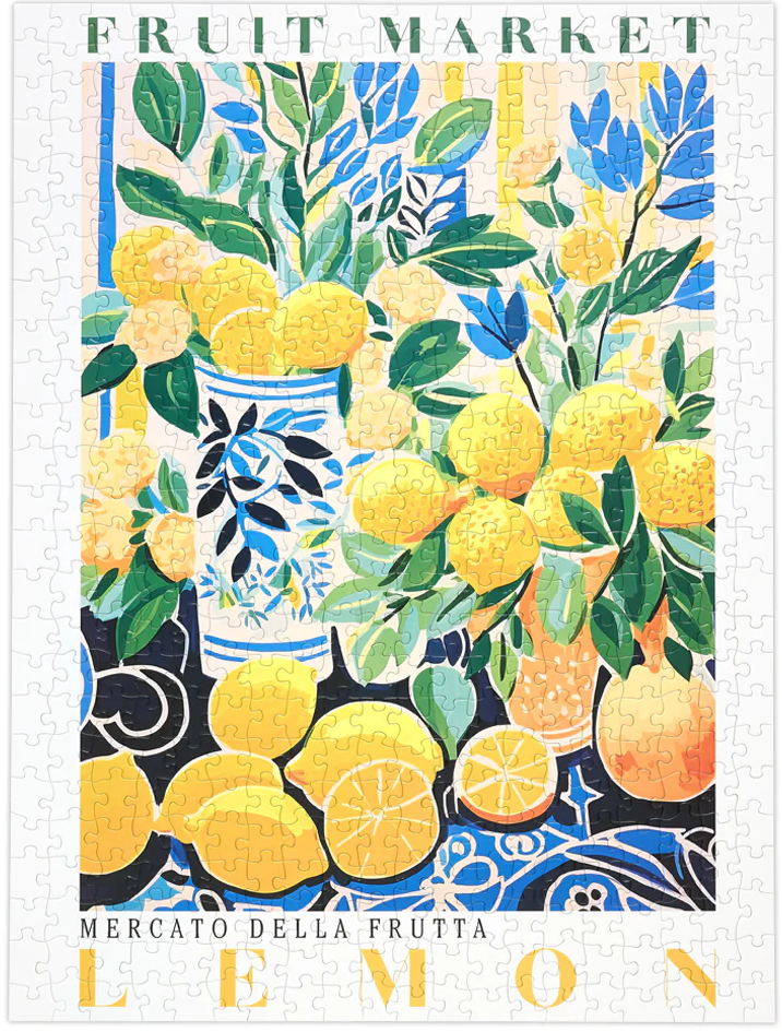 Bring a burst of sunshine to your table with the Fruit Market Lemons 500-piece puzzle. This bright, Mediterranean-inspired scene features lush lemon branches, citrus blossoms, and beautifully patterned ceramic vases arranged in a lively fruit market display. With vibrant yellows, deep greens, and bold blue accents, it's a refreshing, feel-good puzzle that delivers pure visual joy.