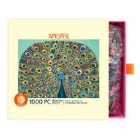 Experience the dazzling spectacle of the Peacock 1000-piece jigsaw puzzle by artist Eli Halpin. This breathtaking illustration is a vibrant masterpiece, capturing the full display of the peacock's tail feathers in a hypnotic pattern of jewel-toned "eyes."